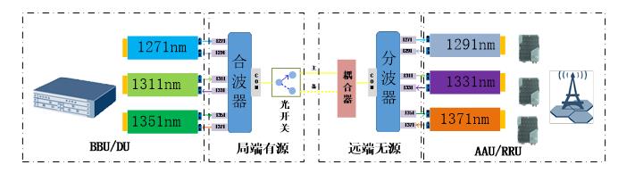 本方案在靠近DU/BBU侧安装有源波分设备,在AAU/RRU侧配置无源合分波器,并安装彩光模块,通过一芯或两芯光纤来实现波分复用,利用局端有源设备来实现局远端设备的有效监控。